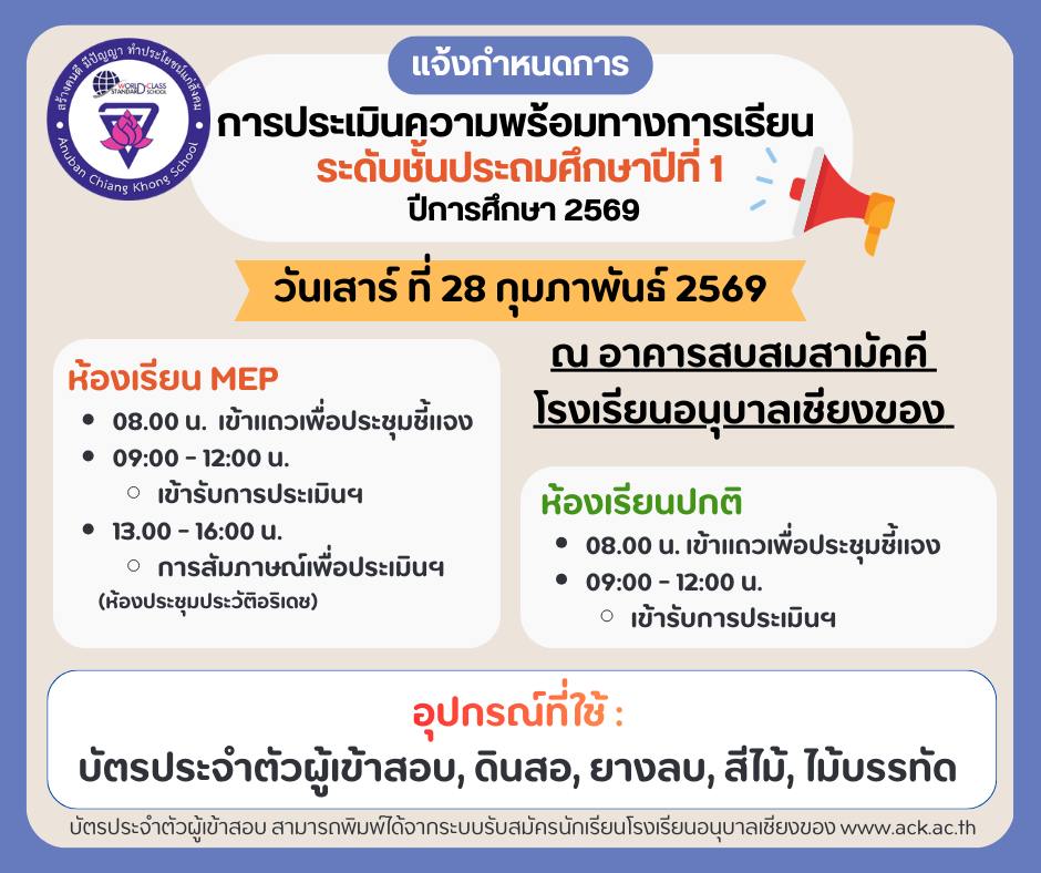 รายชื่อผู้มีสิทธิ์เข้ารับการประเมินความพร้อมทางการเรียนระดับชั้นประถมศึกษาปีที่ 1 ปีการศึกษา 2569