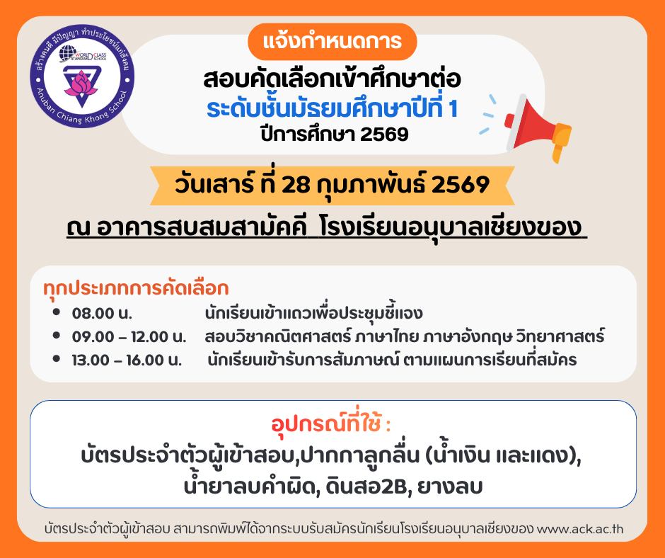รายชื่อผู้มีสิทธิ์เข้าสอบคัดเลือกเข้าศึกษาต่อระดับชั้นมัธยมศึกษาปีที่ 1 ปีการศึกษา 2569