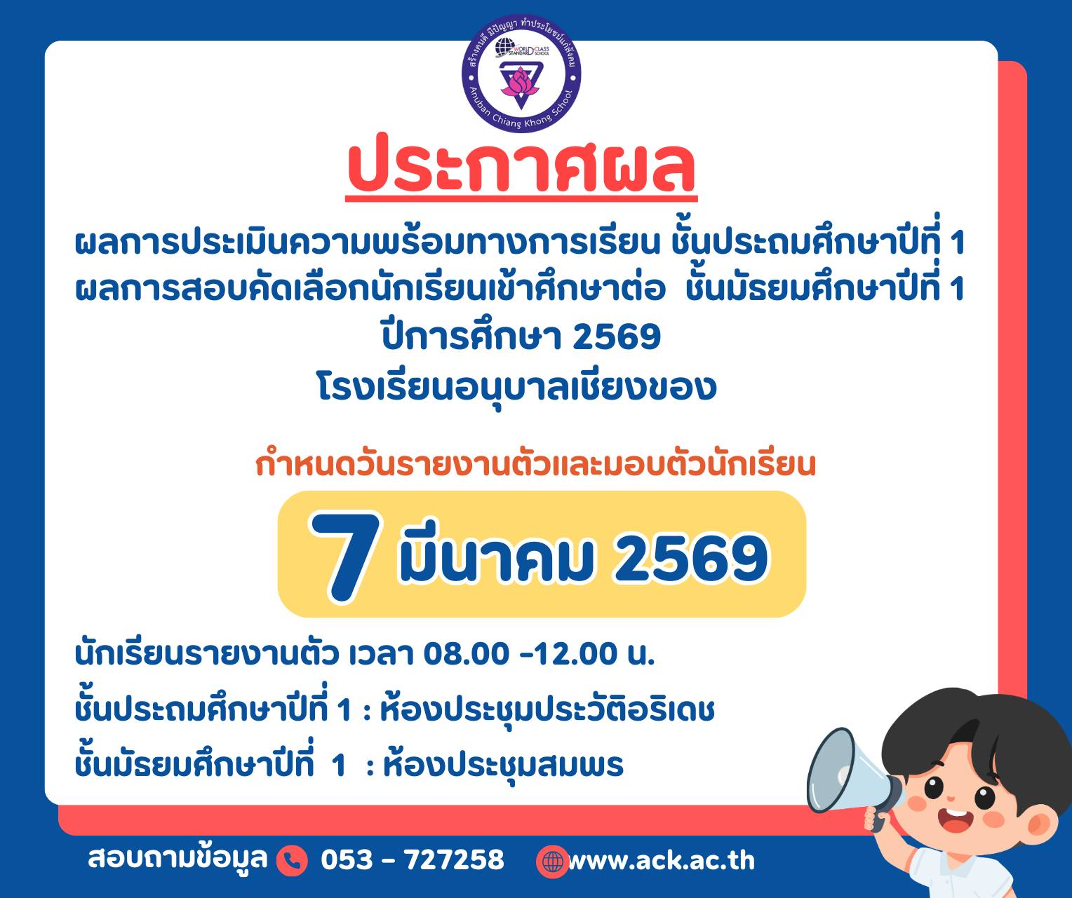รายชื่อผู้มีสิทธิ์เข้ารับการประเมินความพร้อมทางการเรียนระดับชั้นประถมศึกษาปีที่ 1 ปีการศึกษา 2569